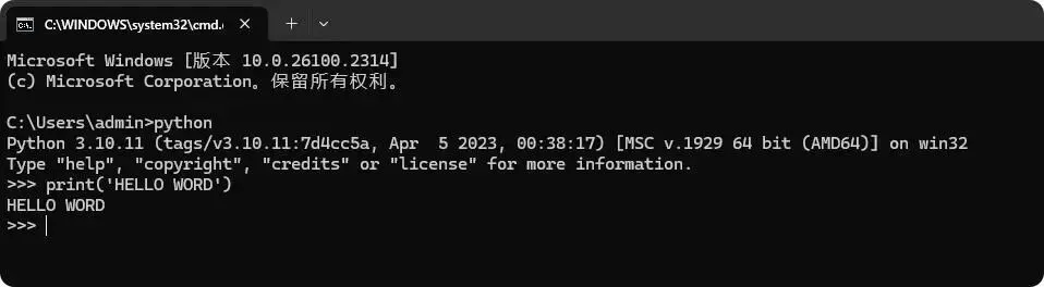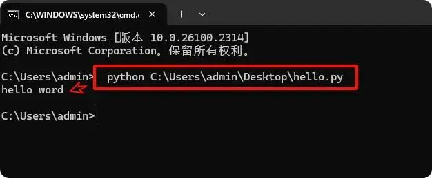 运行文件出结果:cmd打开终端,输入python C:\Users\admin\Desktop\hello.py,回车就能看到Hello World的输出结果。
