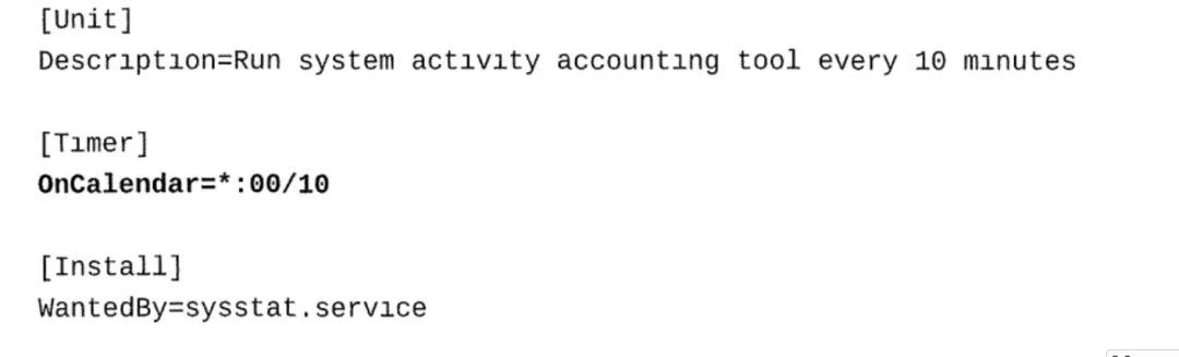 OnCalendar=*:00/10表示timer单元每10分钟激活一次sysstat-collect.service在你完成修改timer unit之后,使用systemctl daemon-reload命令使改变生效。