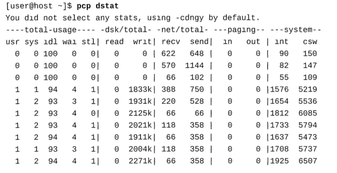 pcp-system-tools包提供了大量的命令行工具来采集和列出性能数据。pcp free命令提供一个 内存使用情况的输出。 yum-y install pcp-system-tools systemctl enable --now pmcd pcp free pcp-dstat命令是通用的性能分析工具。pcp-dstat命令用于在同一时间间隔内查看多个系统资 源。例如,你可以结合磁盘控制器的中断来比较磁盘使用率,或者直接比较网络带宽数和磁盘吞吐 量。 当不使用参数的时候缺省的参数组合是-cdngy。缺省参数表示--cpu,--disk,--net,--page 和--sys 其他有用的选项包括在每一行输出中添加时间戳,在每次更新之间添加延迟,以及要显示的更新计 数。下面的命令显示时间戳的完整字选项,每隔8秒报告一次CPU和进程统计信息。
