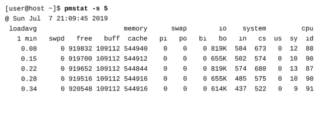pmstat命令提供类似于vmstat的信息。与vmstat一样,pmstat支持调整收集间隔(-t)和样本数 量(-s)的选项。