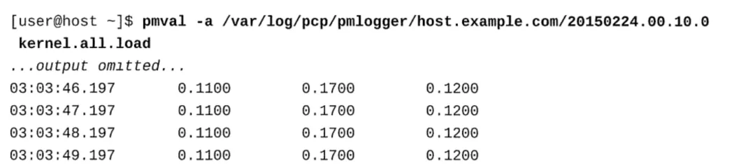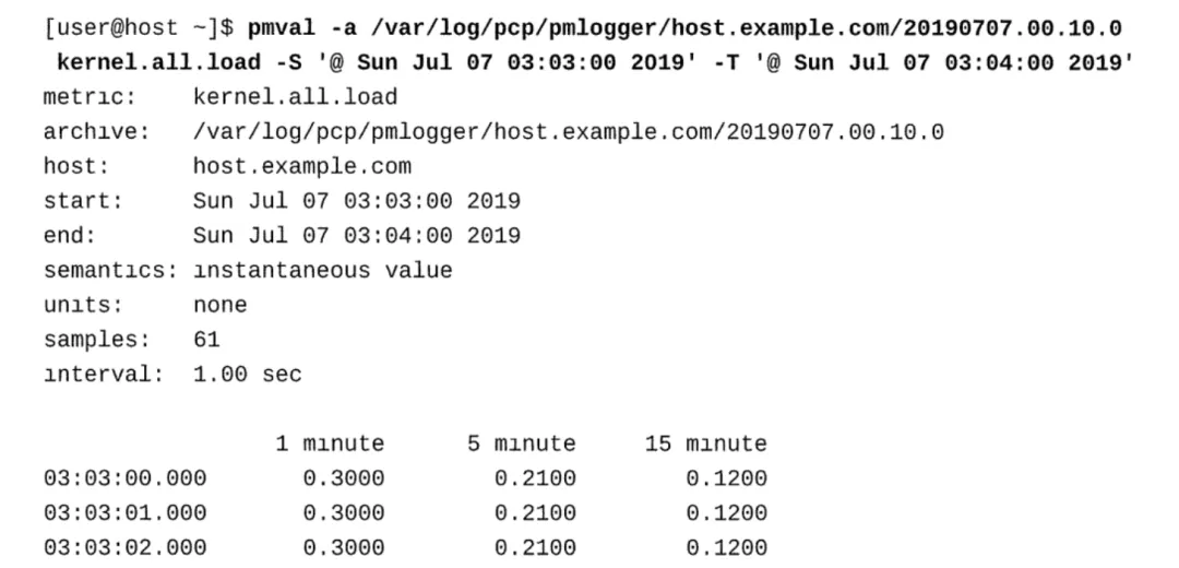 使用pmval命令查看2019年7月07日03:03:00至03:04:00的平均负载: