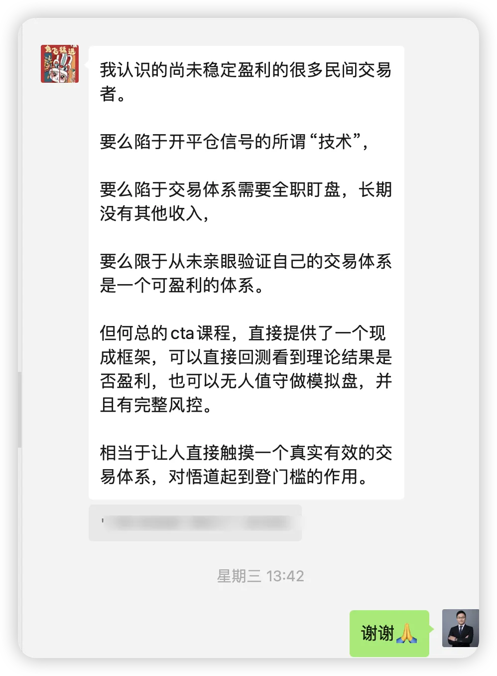 我们从 CTA 交易体系出发,不仅仅培训策略代码, 还有投资组合,实战经验, CTA 心法,AI 编程等方面全方位培养量化交易员。 学员群里面高手如云,可以快速提升理念和实战水平。
