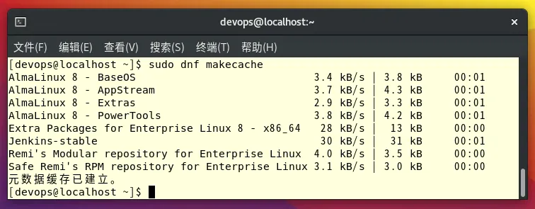 刷新仓库缓存,将新添加的仓库数据信息集成到系统本地中来。第 4 步:在 Almalinux 或 Rocky Linux 上安装 Jenkins 的命令
