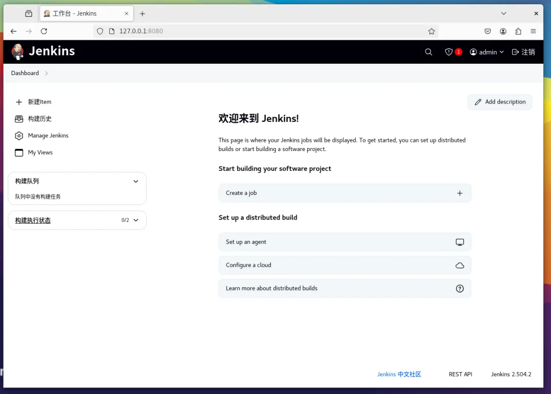 配置完插件后,创建一个管理员用户账户,你将使用该账户稍后登录 Jenkins Web 界面。之后,设置将提供一个实例配置页面,显示用于访问 Jenkins 的当前 URL。只需保存并继续。第 11 步:Jenkins 仪表板