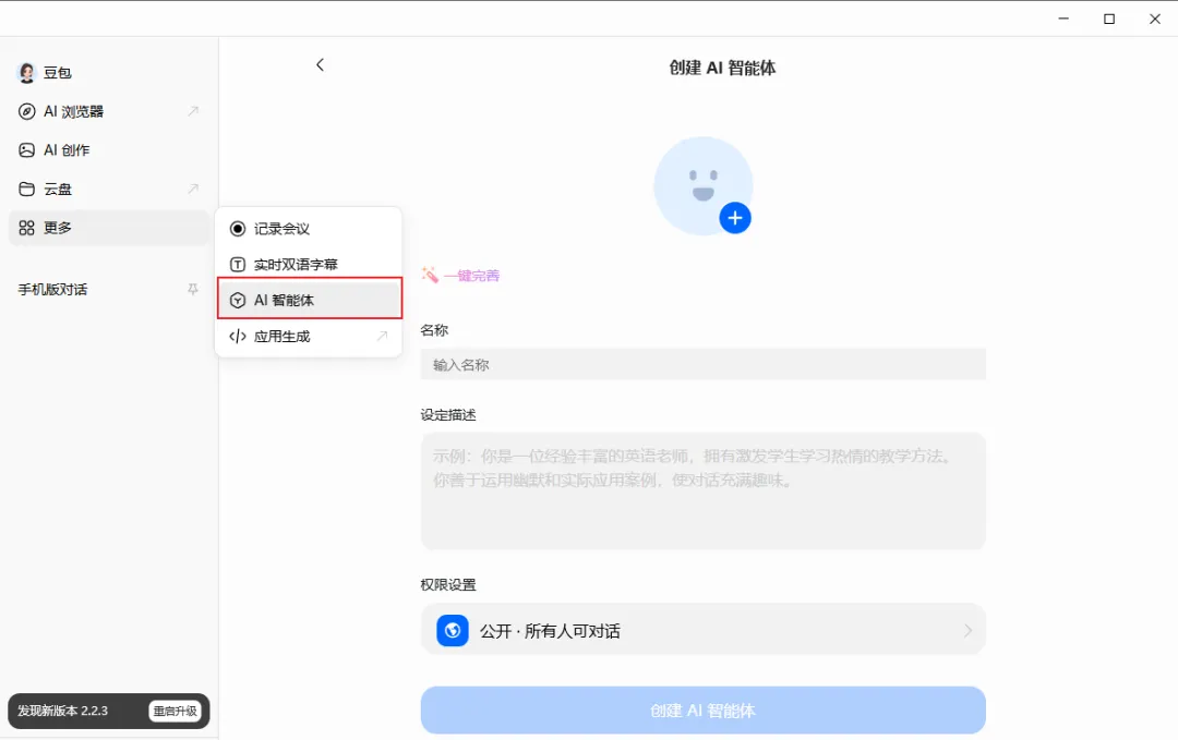 我们进入豆包,在左侧菜单栏中,点击【更多】,找到【AI智能体】,再点击右上角的【创建智能体】