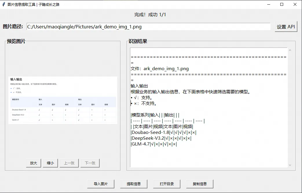 根据上面的样例代码,我们借助Python中的Tkinter 框架,编写了一款图片信息提取工具,实现包括图片的导入、预览、信息提取、复制等功能,基本的样式如下: