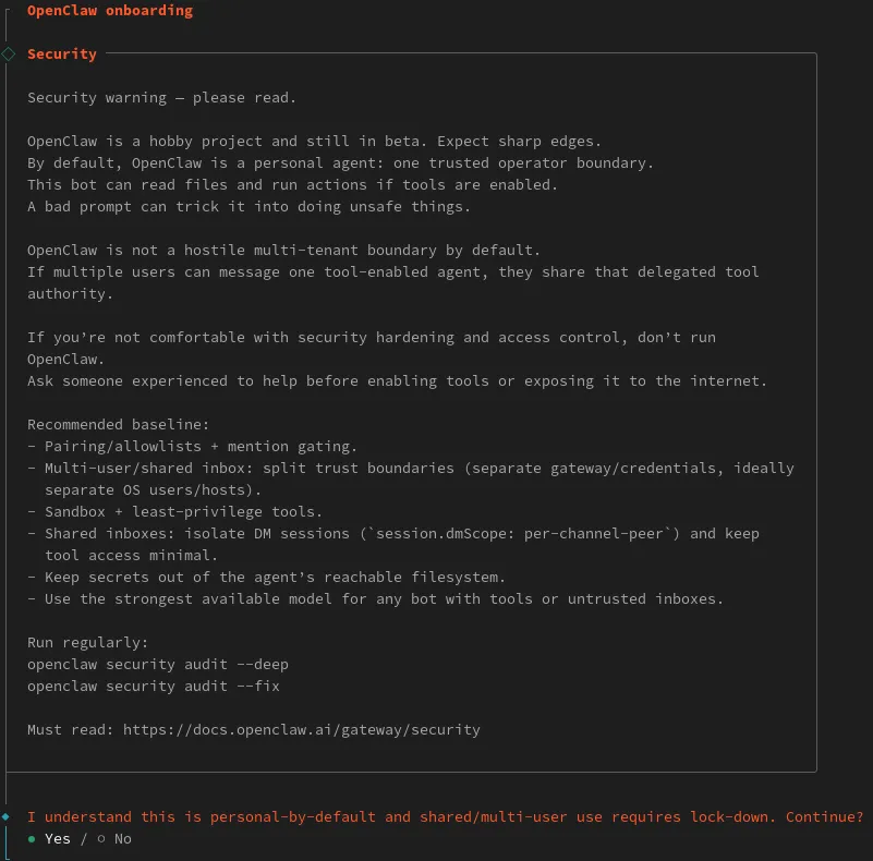 No | 拒绝当前配置,中止启动 | 你计划将 OpenClaw 用于共享 / 多用户环境,或对安全风险不确定 | 避免在未做安全加固的情况下暴露到多用户场景 |