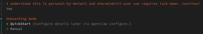 Yes | 确认接受默认配置,继续启动 OpenClaw | 你是唯一使用者(个人服务器 / 本地环境),不会让其他人直接访问这个代理实例 | 仅适合个人使用,多用户场景必须额外做安全加固 |
