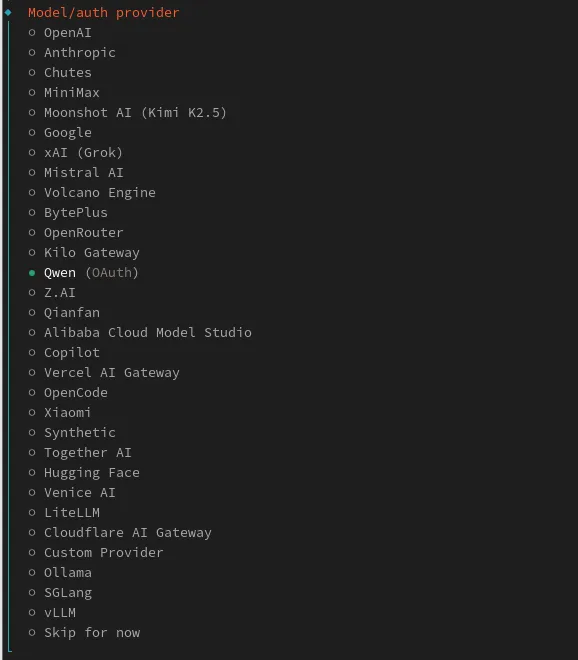 ØOpenClaw 用于选择大模型接入方的配置界面,你可以根据自己的模型使用场景选择对应提供商。