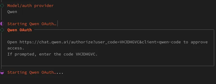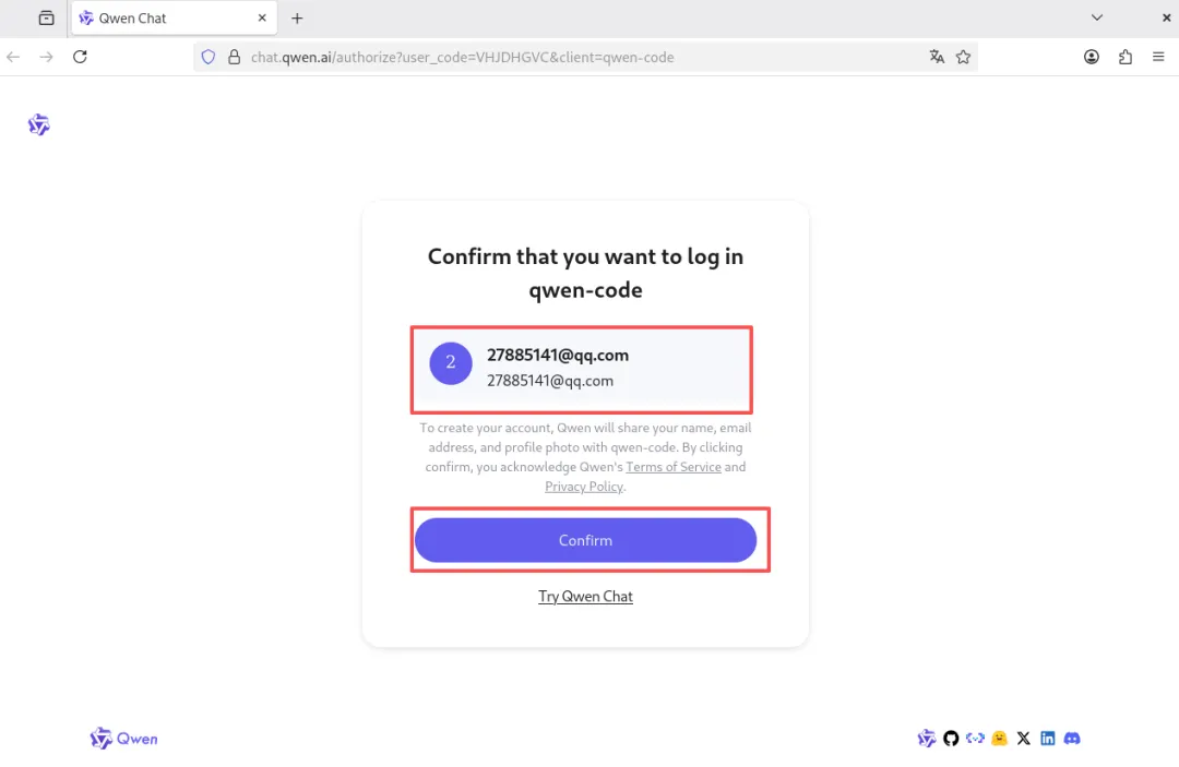 需要登陆https://chat.qwen.ai/authorize?user_code=VHJDHGVC&client=qwen-code,如果没有账号,需要注册账号并登陆。