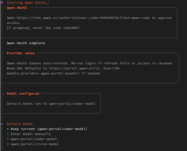 5、配置默认model,我选择“Keep current (qwen-portal/coder-model)”