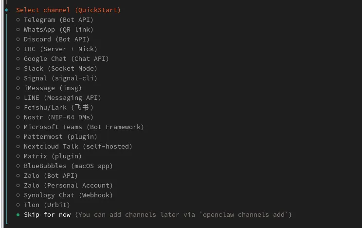 其他/暂不配置 | Skip for now | 暂时跳过通道配置,后续通过 openclaw configure 补充 |