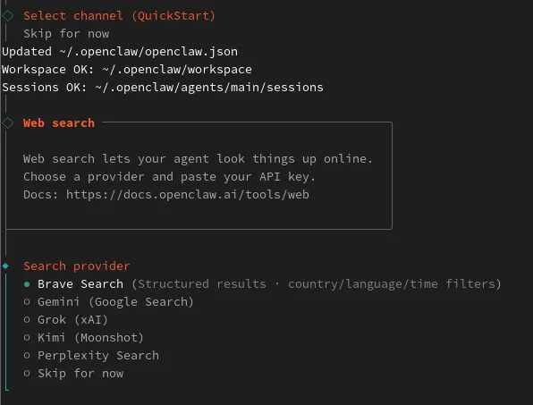 l离线 / 暂不需要搜索:选择 Skip for now,后续可通过 openclaw configure 重新配置。