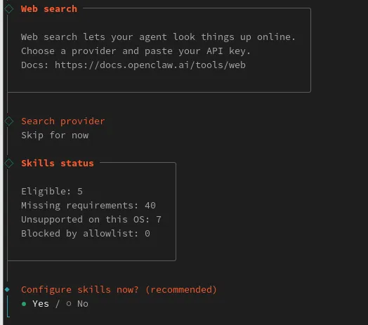Yes | 进入技能配置向导,开启并配置 OpenClaw 的工具能力(如文件操作、系统命令、搜索、代码执行等) | ✅ 希望 OpenClaw 具备实际执行能力(如读写文件、调用命令、联网搜索)✅ 官方推荐,能让代理从 “聊天” 升级为 “可执行任务的助手” |