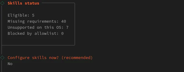 No | 跳过技能配置,仅保留基础对话能力,后续可通过 openclaw configure 补充 | ✅ 暂时只想体验基础对话功能✅ 先完成核心部署,再逐步开放工具权限 |
