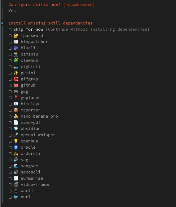 Skip for now | 暂时跳过所有依赖安装,仅启动基础功能,后续可通过 openclaw configure 补充 | ✅ 快速完成部署✅ 暂时不需要额外技能 |