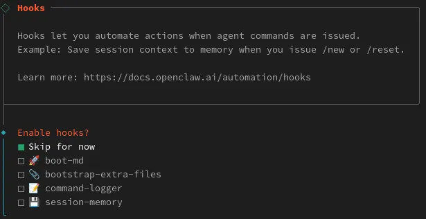 Skip for now | 暂时跳过 | 不启用任何钩子,仅保留核心功能 | ✅ 快速部署✅ 暂时不需要扩展功能 | 无,最小化启动 |