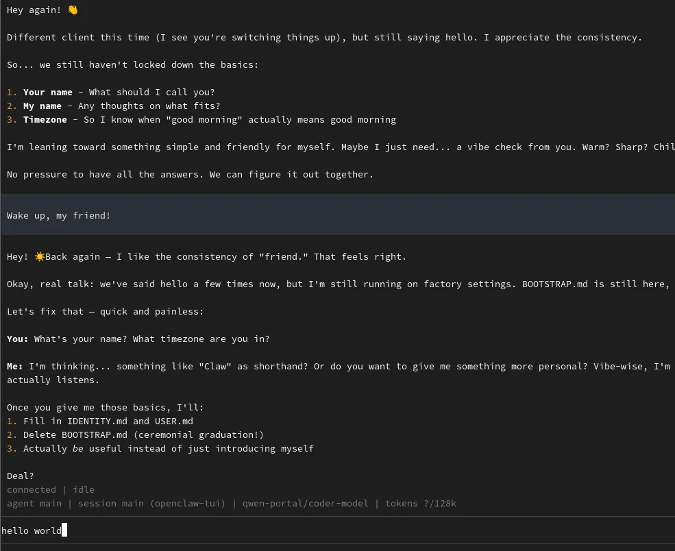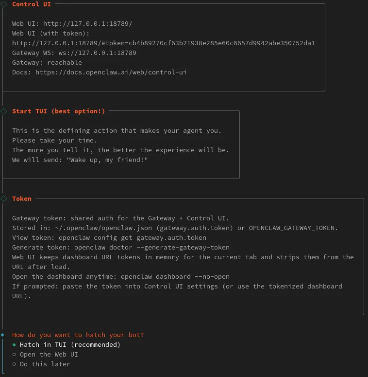 Hatch in TUI (recommended) | 以终端交互界面启动(推荐) | ✅ 基于终端的图形化界面(TUI),无需浏览器✅ 官方推荐,功能完整且轻量✅ 直接在服务器终端操作,适配无图形界面环境 | ✅ 服务器 / 无桌面环境部署✅ 新手快速上手✅ 偏好终端操作 | 低(终端内可视化操作) |