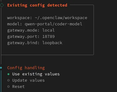 OpenClaw 在启动或重新配置时,对已有配置文件的处理方式选择