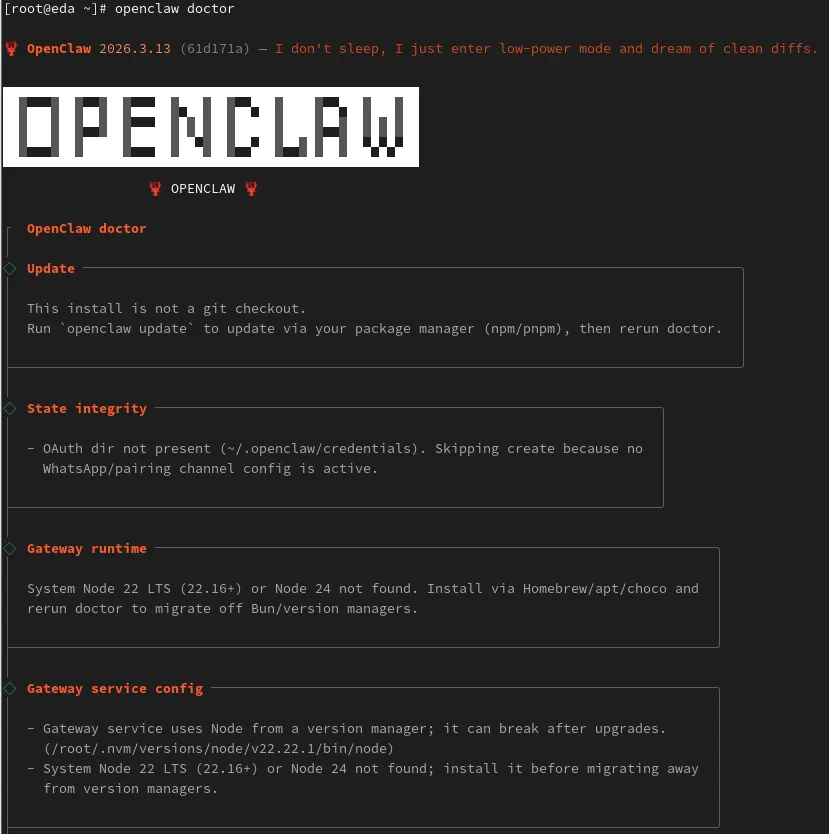 4、openclaw doctor:检查环境是否正常(排查配置/依赖问题)