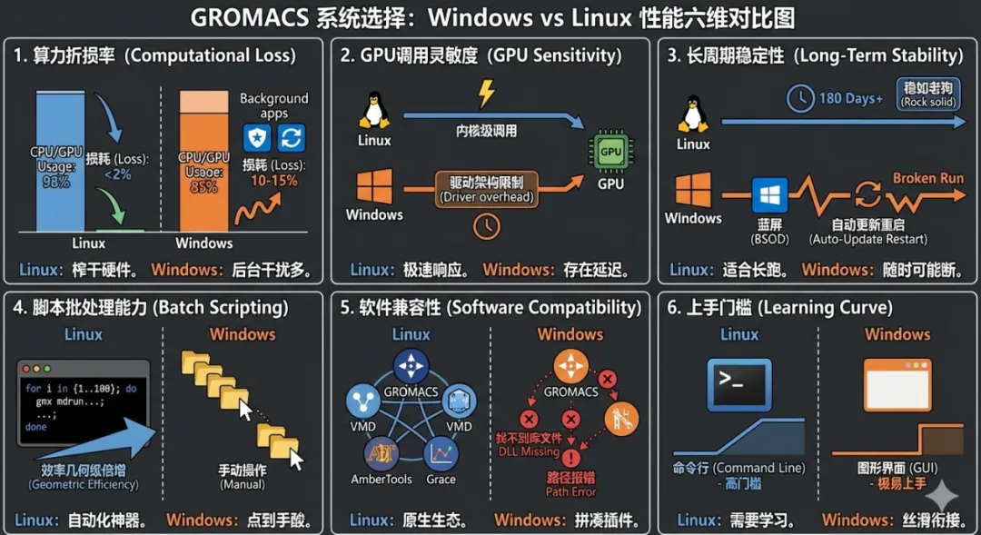 Linux 支持内核级(Kernel-level)调用 GPU,响应极速。而 Windows 受限于 WDDM 驱动架构,存在明显的驱动开销(Driver Overhead)和延迟。在高度依赖 GPU 加速的 GROMACS 模拟中,这种差距会被进一步放大。