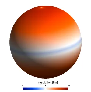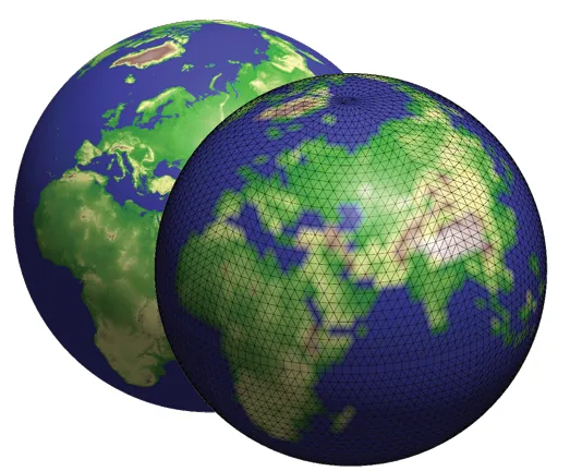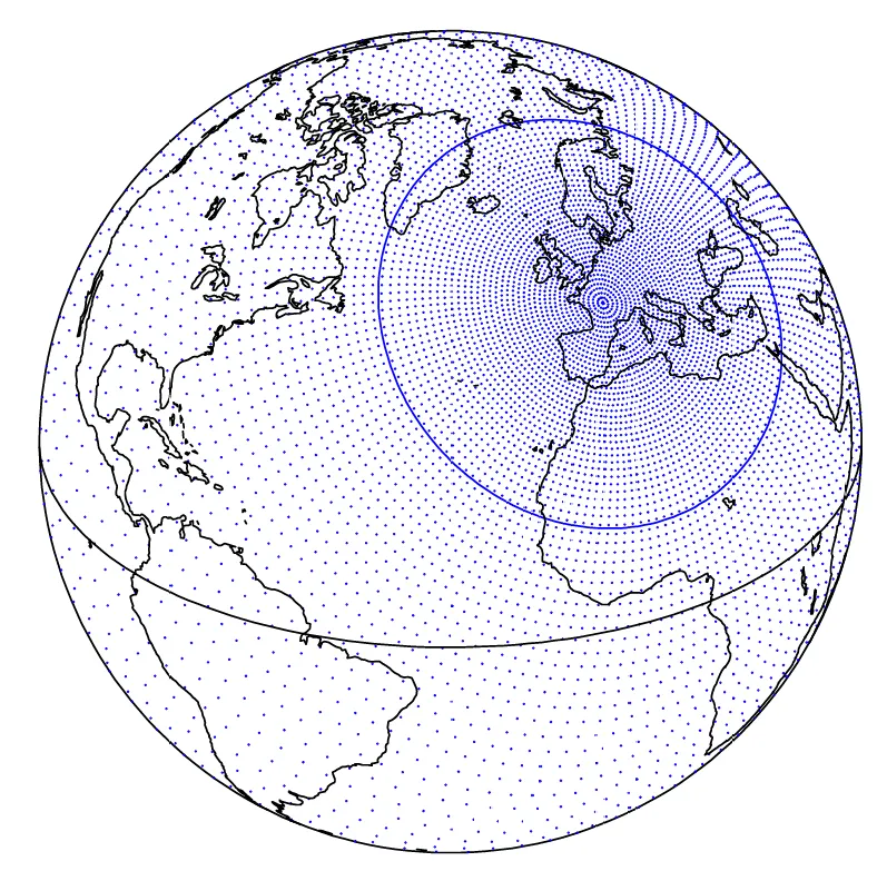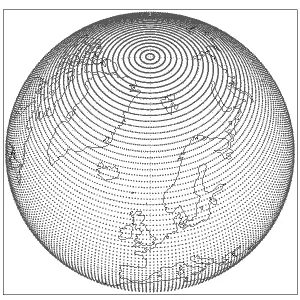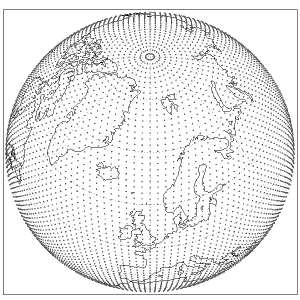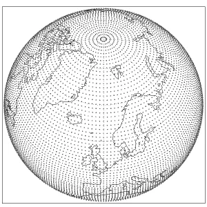 它是一种缩减高斯网格的形式,其纬线数量及所在的纬度值与原始高斯网格相同,但在极点与赤道之间的每个纬线圈上,经度点的数量是根据以下公式计算的: