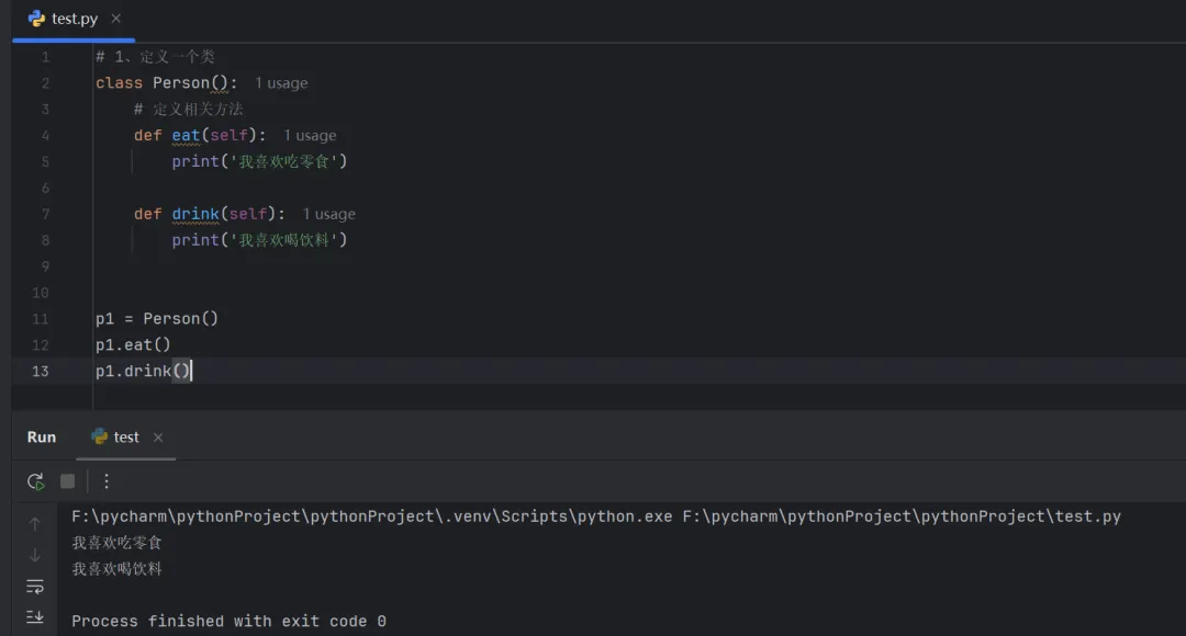 # 1、定义一个类class Person(): # 定义相关方法 def eat(self): print('我喜欢吃零食') def drink(self): print('我喜欢喝饮料')p1 = Person()p1.eat()p1.drink()