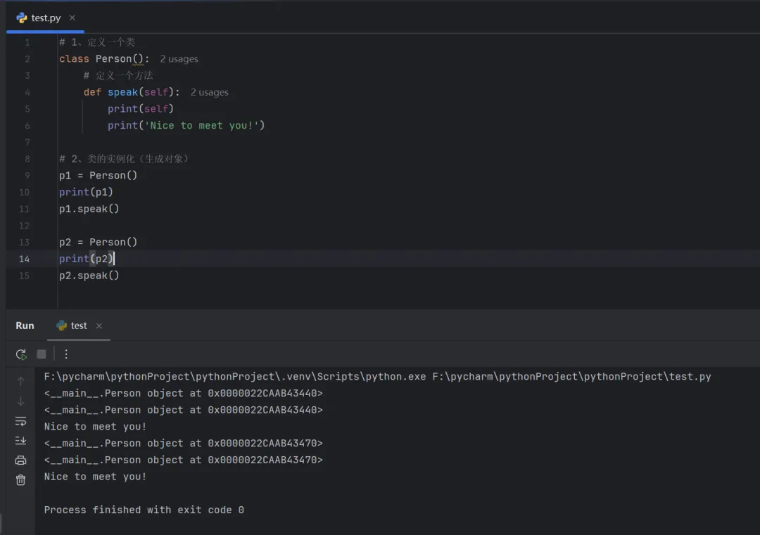 # 1、定义一个类class Person(): # 定义一个方法 def speak(self):print(self)print('Nice to meet you!')# 2、类的实例化(生成对象)p1 = Person()print(p1)p1.speak()p2 = Person()print(p2)p2.speak()