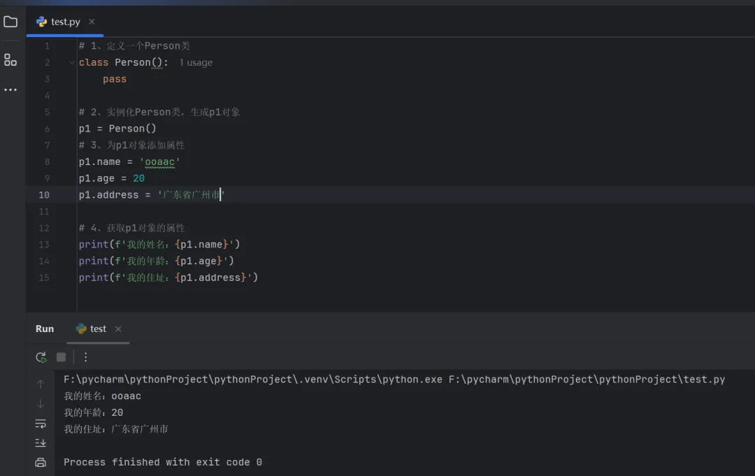 # 1、定义一个Person类class Person(): pass# 2、实例化Person类,生成p1对象p1 = Person()# 3、为p1对象添加属性p1.name = 'ooaac'p1.age = 20p1.address = '广东省广州市'# 4、获取p1对象的属性print(f'我的姓名:{p1.name}')print(f'我的年龄:{p1.age}')print(f'我的住址:{p1.address}')
