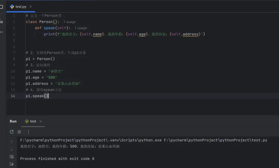 # 定义一个Person类class Person(): def speak(self): print(f'我的名字:{self.name},我的年龄:{self.age},我的住址:{self.address}')# 2、实例化Person类,生成p1对象p1 = Person()# 3、添加属性p1.name = '孙悟空'p1.age = '500'p1.address = '花果山水帘洞'# 4、调用speak方法p1.speak()