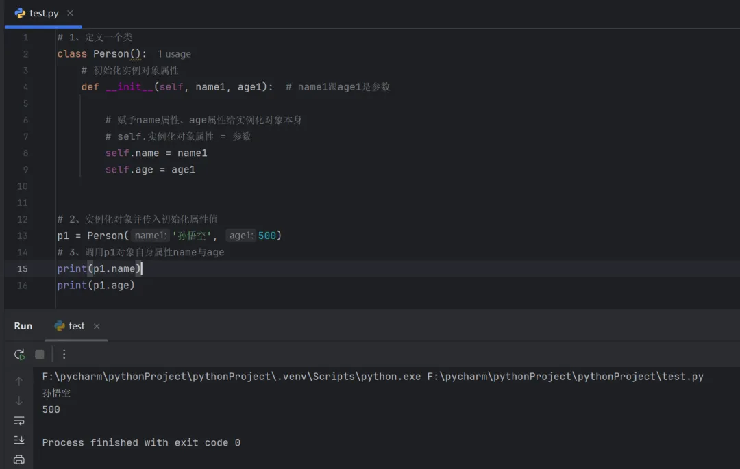 # 1、定义一个类class Person(): # 初始化实例对象属性 def __init__(self, name1, age1): # name1跟age1是参数 # 赋予name属性、age属性给实例化对象本身 # self.实例化对象属性 = 参数 self.name = name1 self.age = age1# 2、实例化对象并传入初始化属性值p1 = Person('孙悟空', 500)# 3、调用p1对象自身属性name与ageprint(p1.name)print(p1.age)