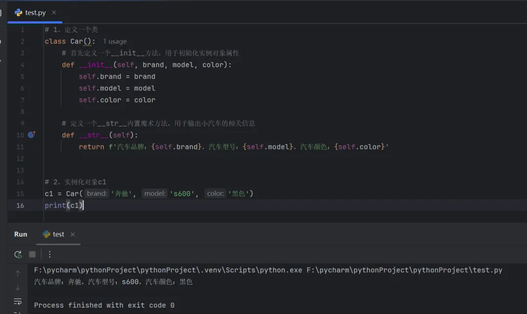 # 1、定义一个类class Car(): # 首先定义一个__init__()方法,用于初始化实例对象属性 def __init__(self, brand, model, color): self.brand = brand self.model = model self.color = color # 定义一个__str__()内置魔术方法,用于输出小汽车的相关信息 def __str__(self): return f'汽车品牌:{self.brand},汽车型号:{self.model},汽车颜色:{self.color}'# 2、实例化对象c1c1 = Car('奔驰', 's600', '黑色')print(c1)