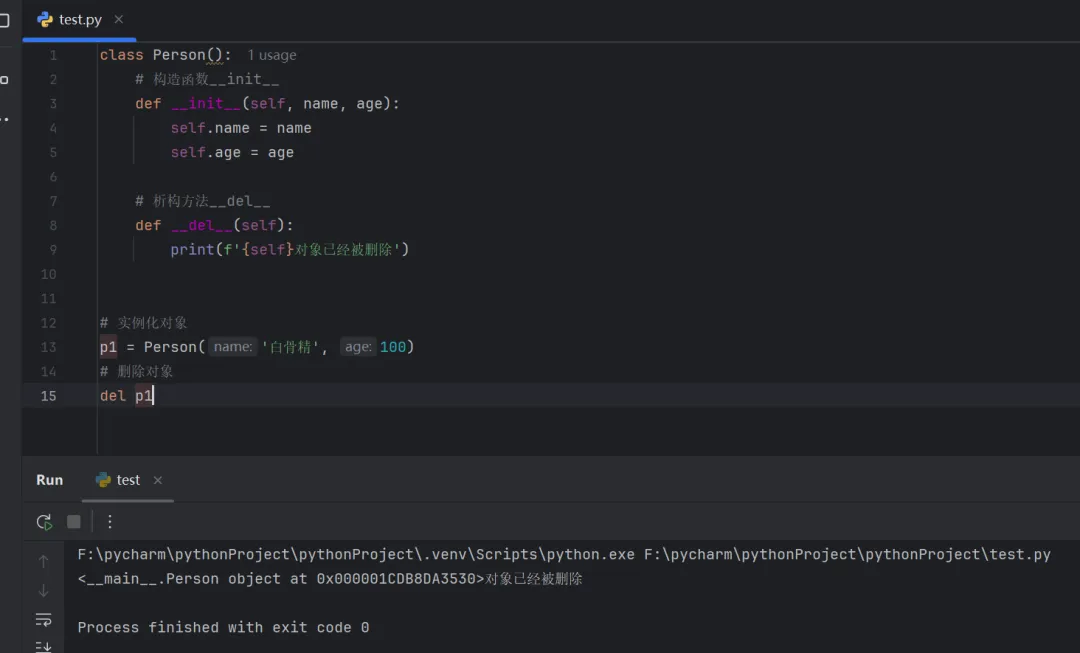 class Person(): # 构造函数__init__ def __init__(self, name, age): self.name = name self.age = age # 析构方法__del__ def __del__(self): print(f'{self}对象已经被删除')# 实例化对象p1 = Person('白骨精', 100)# 删除对象del p1