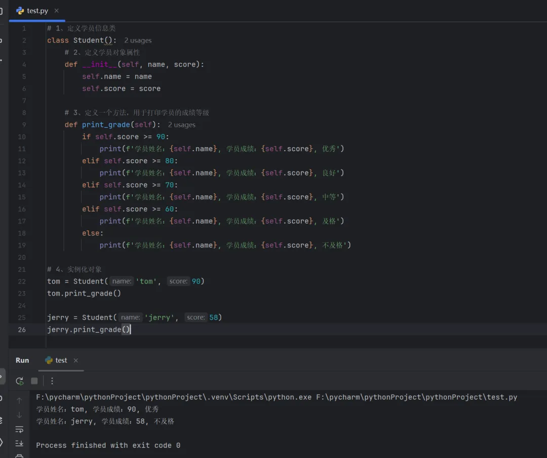 # 1、定义学员信息类class Student(): # 2、定义学员对象属性 def __init__(self, name, score): self.name = name self.score = score # 3、定义一个方法,用于打印学员的成绩等级 def print_grade(self): if self.score >= 90: print(f'学员姓名:{self.name}, 学员成绩:{self.score}, 优秀') elif self.score >= 80: print(f'学员姓名:{self.name}, 学员成绩:{self.score}, 良好') elif self.score >= 70: print(f'学员姓名:{self.name}, 学员成绩:{self.score}, 中等') elif self.score >= 60: print(f'学员姓名:{self.name}, 学员成绩:{self.score}, 及格') else: print(f'学员姓名:{self.name}, 学员成绩:{self.score}, 不及格')# 4、实例化对象tom = Student('tom', 90)tom.print_grade()jerry = Student('jerry', 58)jerry.print_grade()