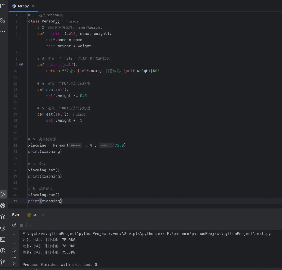 # 1、定义Person类class Person(): # 2、初始化对象属性,name和weight def __init__(self, name, weight): self.name = name self.weight = weight # 3、定义一个__str__方法打印对象的信息 def __str__(self): return f'姓名:{self.name},目前体重:{self.weight}KG' # 4、定义一个run方法代表跑步 def run(self): self.weight -= 0.5 # 5、定义一个eat方法代表吃饭 def eat(self): self.weight += 1# 6、实例化对象xiaoming = Person('小明', 75.0)print(xiaoming)# 7、吃饭xiaoming.eat()print(xiaoming)# 8、减肥跑步xiaoming.run()print(xiaoming)