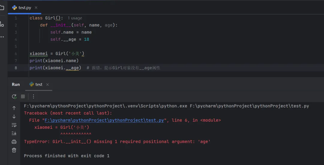 class Girl(): def __init__(self, name, age): self.name = name self.__age = 18xiaomei = Girl('小美')print(xiaomei.name)print(xiaomei.__age) # 报错,提示Girl对象没有__age属性