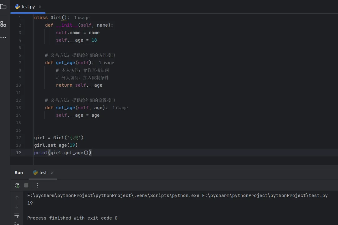 class Girl(): def __init__(self, name): self.name = name self.__age = 18 # 公共方法:提供给外部的访问接口 def get_age(self): # 本人访问:允许直接访问 # 外人访问:加入限制条件 return self.__age # 公共方法:提供给外部的设置接口 def set_age(self, age): self.__age = agegirl = Girl('小美')girl.set_age(19)print(girl.get_age())