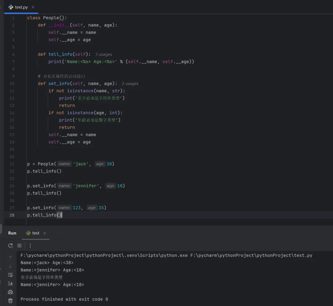 class People(): def __init__(self, name, age): self.__name = name self.__age = age def tell_info(self): print('Name:<%s> Age:<%s>' % (self.__name, self.__age)) # 对私有属性的访问接口 def set_info(self, name, age): ifnot isinstance(name, str): print('名字必须是字符串类型') return ifnot isinstance(age, int): print('年龄必须是数字类型') return self.__name = name self.__age = agep = People('jack', 38)p.tell_info()p.set_info('jennifer', 18)p.tell_info()p.set_info(123, 35)p.tell_info()