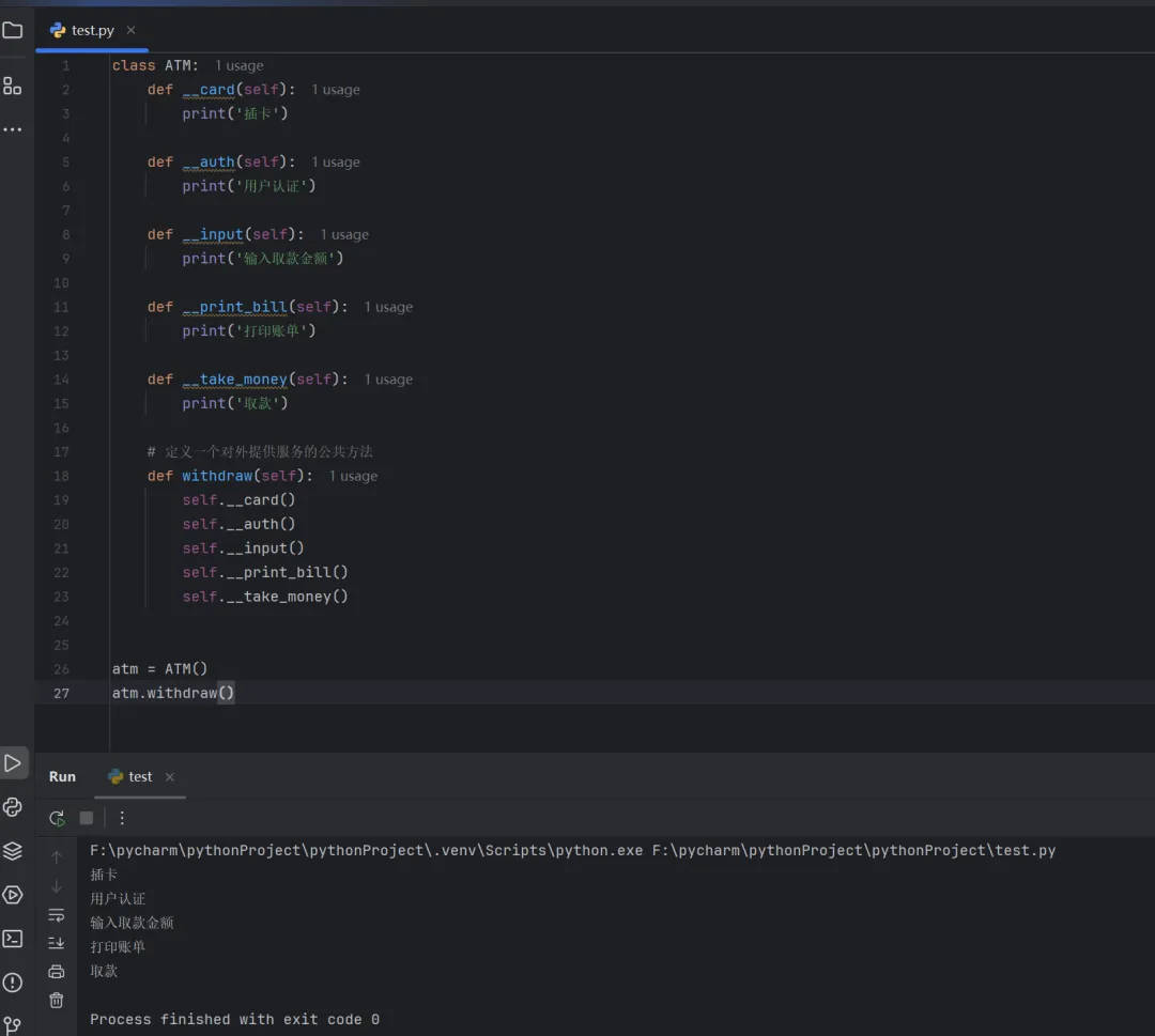 classATM: def __card(self): print('插卡') def __auth(self): print('用户认证') def __input(self): print('输入取款金额') def __print_bill(self): print('打印账单') def __take_money(self): print('取款') # 定义一个对外提供服务的公共方法 def withdraw(self): self.__card() self.__auth() self.__input() self.__print_bill() self.__take_money()atm = ATM()atm.withdraw()