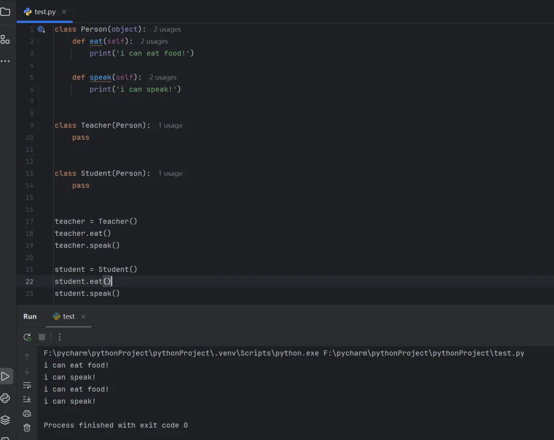 class Person(object): def eat(self): print('i can eat food!') def speak(self): print('i can speak!')class Teacher(Person): passclass Student(Person): passteacher = Teacher()teacher.eat()teacher.speak()student = Student()student.eat()student.speak()