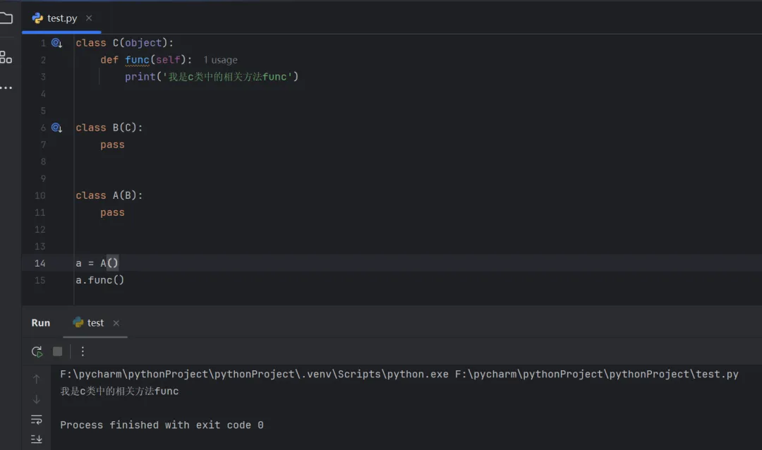 class C(object): def func(self): print('我是c类中的相关方法func')class B(C): passclass A(B): passa = A()a.func()
