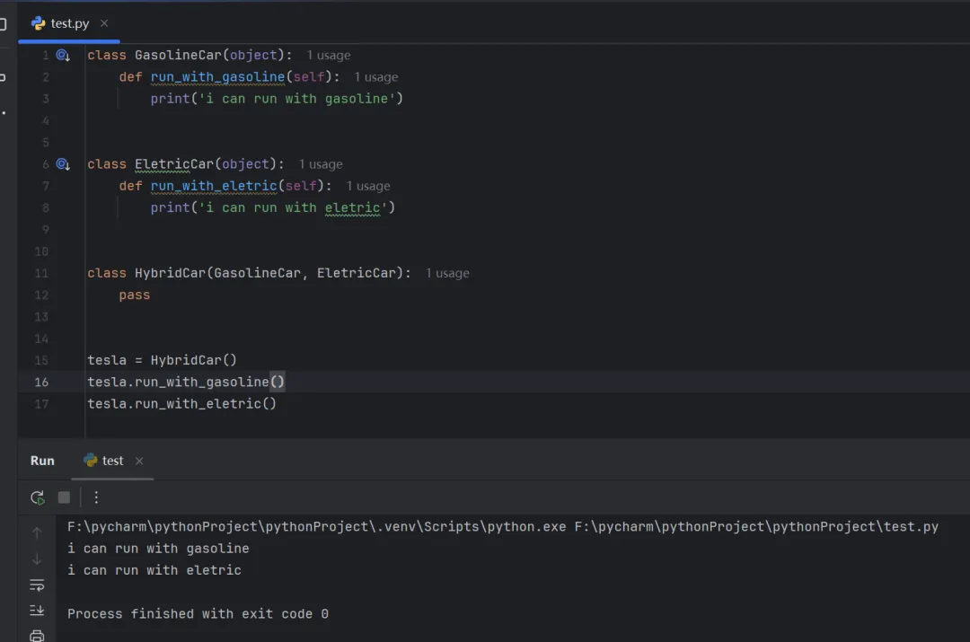 class GasolineCar(object): def run_with_gasoline(self): print('i can run with gasoline')class EletricCar(object): def run_with_eletric(self): print('i can run with eletric')class HybridCar(GasolineCar, EletricCar): passtesla = HybridCar()tesla.run_with_gasoline()tesla.run_with_eletric()