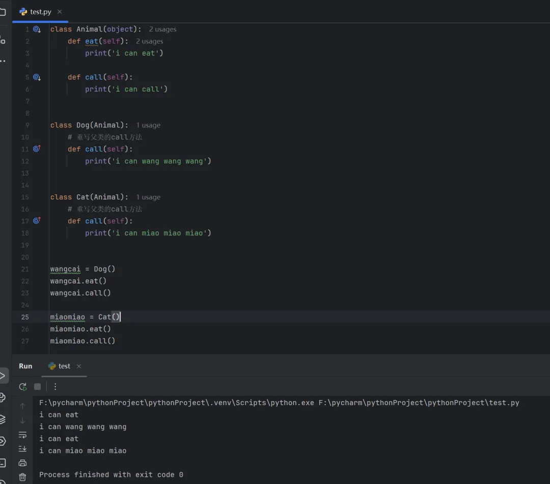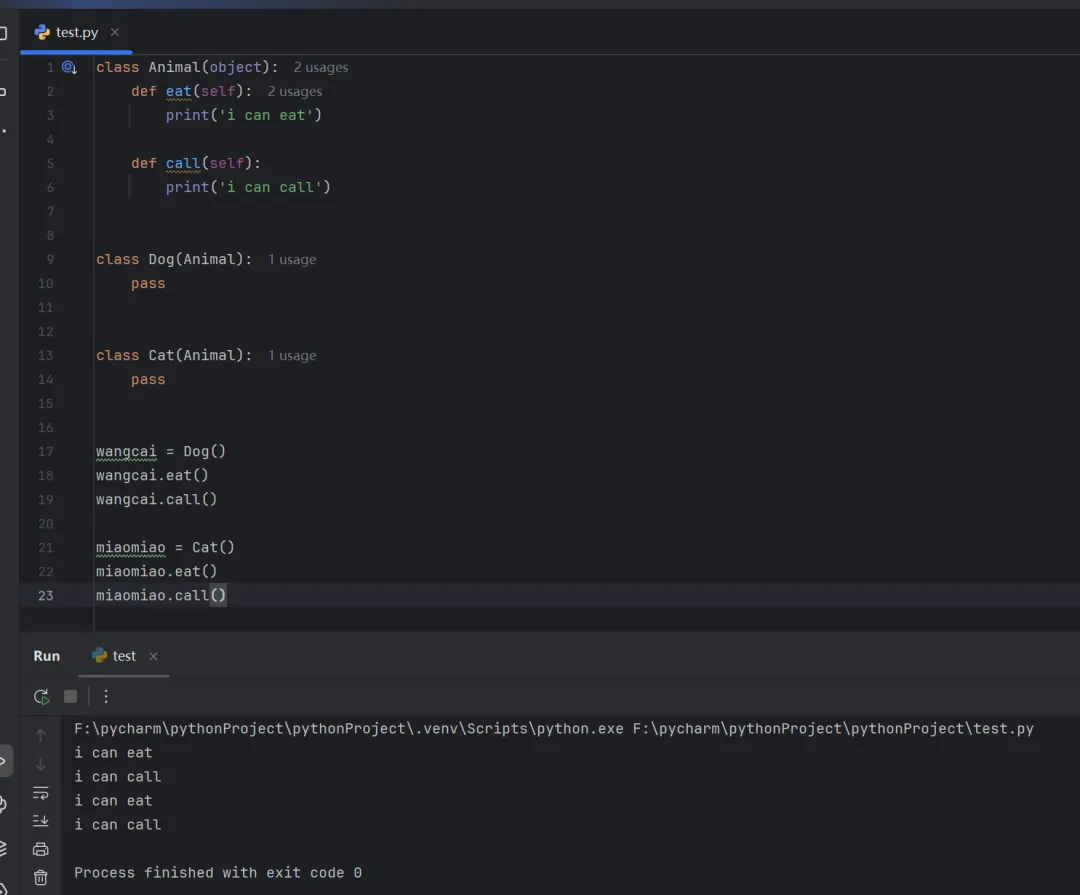class Animal(object): def eat(self):print('i can eat') def call(self):print('i can call')class Dog(Animal): passclass Cat(Animal): passwangcai = Dog()wangcai.eat()wangcai.call()miaomiao = Cat()miaomiao.eat()miaomiao.call()