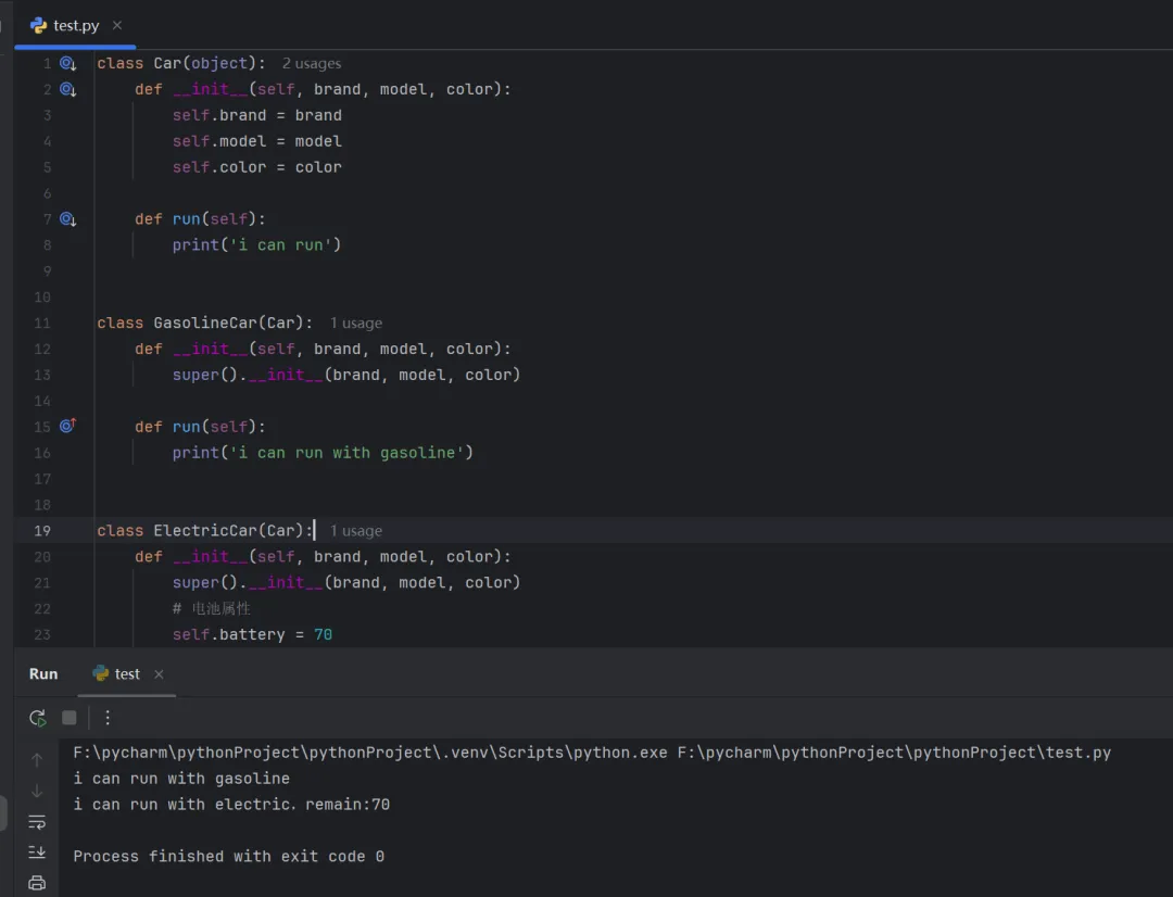 class Car(object): def __init__(self, brand, model, color): self.brand = brand self.model = model self.color = color def run(self): print('i can run')class GasolineCar(Car): def __init__(self, brand, model, color): super().__init__(brand, model, color) def run(self): print('i can run with gasoline')class ElectricCar(Car): def __init__(self, brand, model, color): super().__init__(brand, model, color) # 电池属性 self.battery = 70 def run(self): print(f'i can run with electric,remain:{self.battery}')bwm = GasolineCar('宝马', 'X5', '白色')bwm.run()tesla = ElectricCar('特斯拉', 'Model S', '红色')tesla.run()