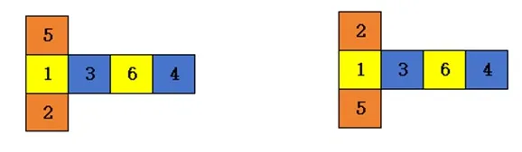 首先,我们构建一个立方体, 每个面的标号为1,2,3,4,5,6, 每个面的有四个相邻面, 他们的对应关系如下, 注意四个相邻面的次序是按照固定顺序的(顺时针或者逆时针), 其中1和6是对立面, 2和5是对立面,3和4是对立面。