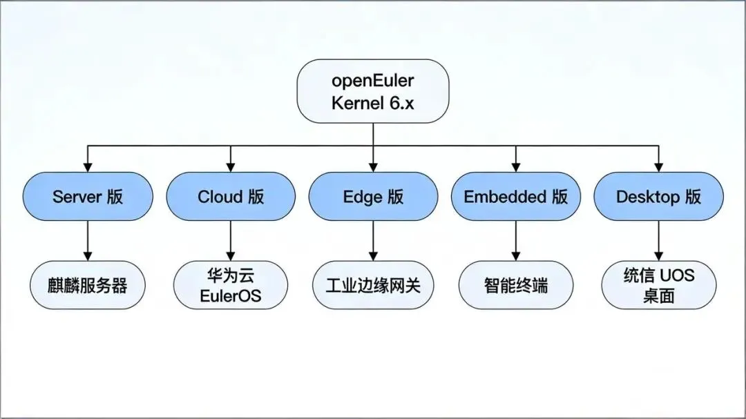 关键决策:“上游优先”原则 —— 所有代码优先提交 Linux 主线,避免私有分支。openEuler 不再是单一服务器 OS,而是 “一套内核,多场景衍生” 的架构: | | |