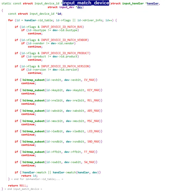 整个匹配过程事件驱动占主导,判断设备驱动是否符合事件驱动的要求,如果符合就返回匹配上的struct input_device_id结构体指针;