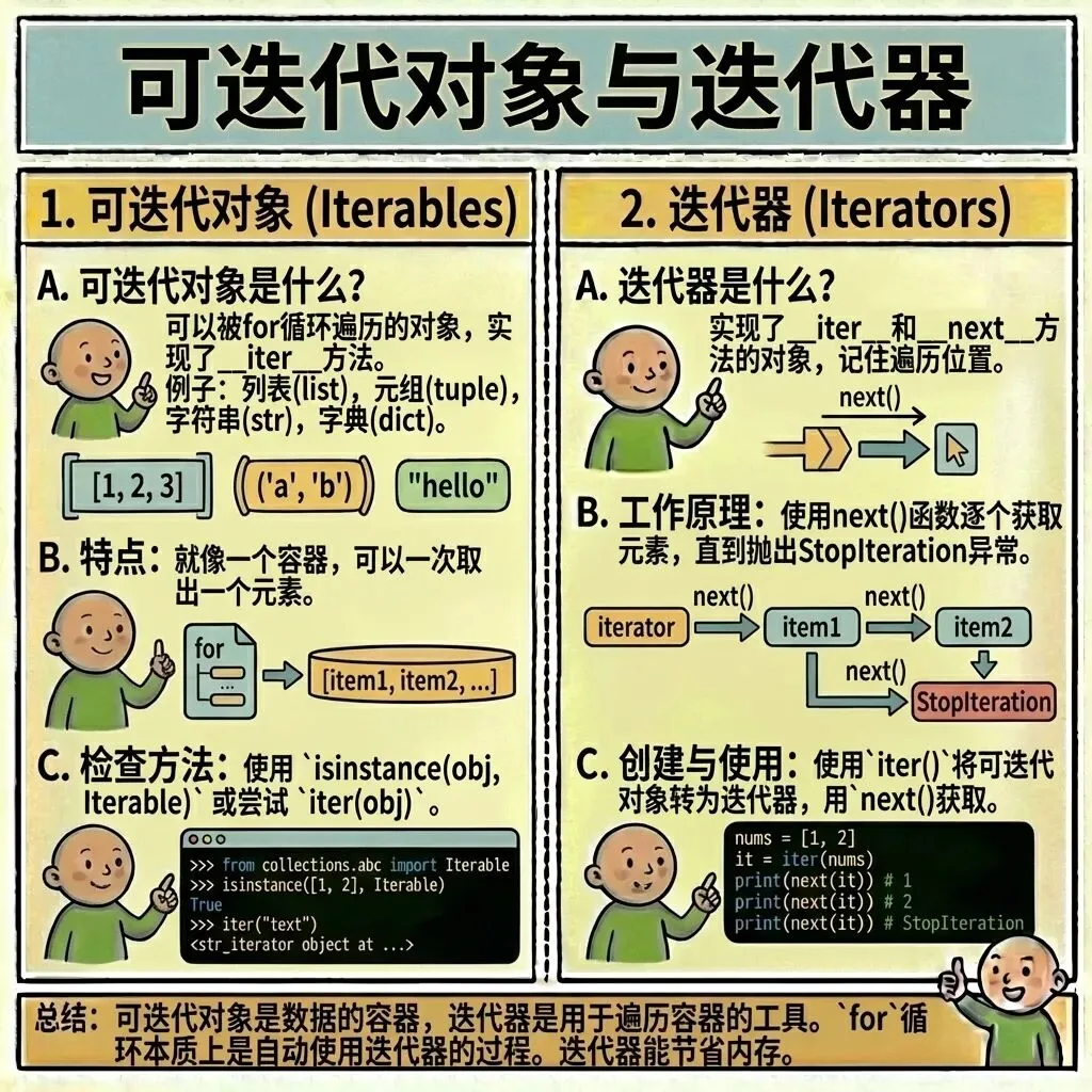 2.迭代器(Iterator):是可迭代对象的“遍历工具”,迭代器同时实现__iter__()和__next__()方法,其能通过next()函数逐个返回元素,遍历完会抛出StopIteration异常。