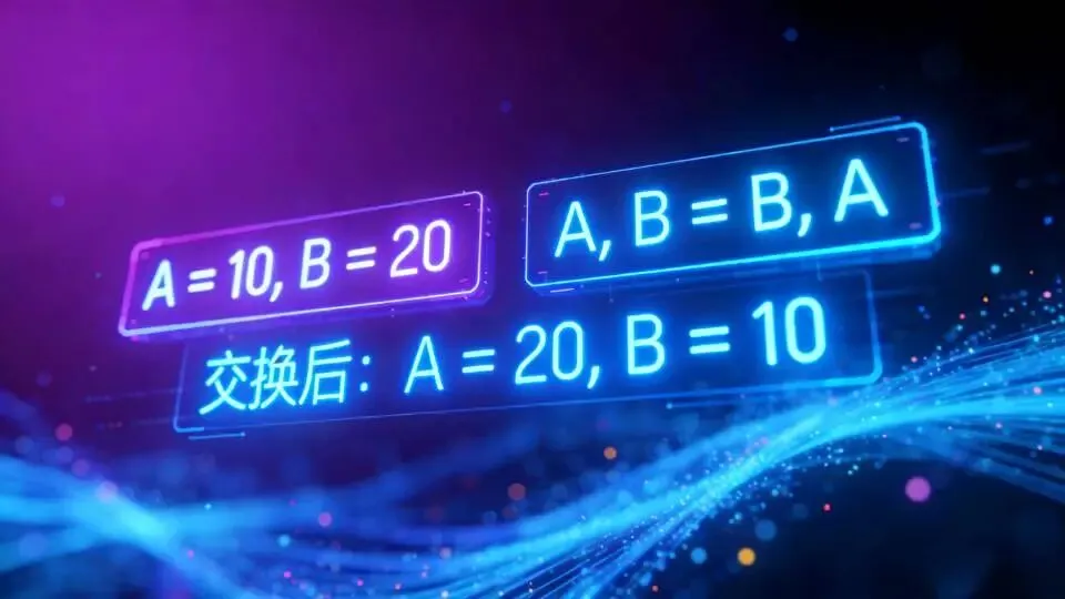 换A和B的值,不用先找个临时变量存A。直接写“A, B = B, A”就行,Python自己会处理,一步到位。