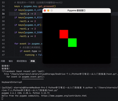 # 思路:给每个物体创建“矩形碰撞框”,判断两个矩形是否重叠# 1. 定义两个物体的矩形(x,y,宽,高)rect1 = pygame.Rect(100, 100, 50, 50) # 红色矩形rect2 = pygame.Rect(150, 150, 50, 50) # 绿色矩形while running:# 绘制两个矩形pygame.draw.rect(screen, (255,0,0), rect1)pygame.draw.rect(screen, (0,255,0), rect2)# 碰撞检测:如果两个矩形重叠,返回Trueif rect1.colliderect(rect2):print("碰撞啦!")# 移动其中一个矩形(比如按方向键移动rect1)keys = pygame.key.get_pressed()if keys[pygame.K_LEFT]:rect1.x -= 2if keys[pygame.K_RIGHT]:rect1.x += 2if keys[pygame.K_UP]:rect1.y -= 2if keys[pygame.K_DOWN]:rect1.y += 2for event in pygame.event.get():# 点击窗口关闭按钮,退出游戏if event.type == pygame.QUIT:running = False # 结束主循环pygame.quit() # 退出Pygameexit()pygame.display.update()
